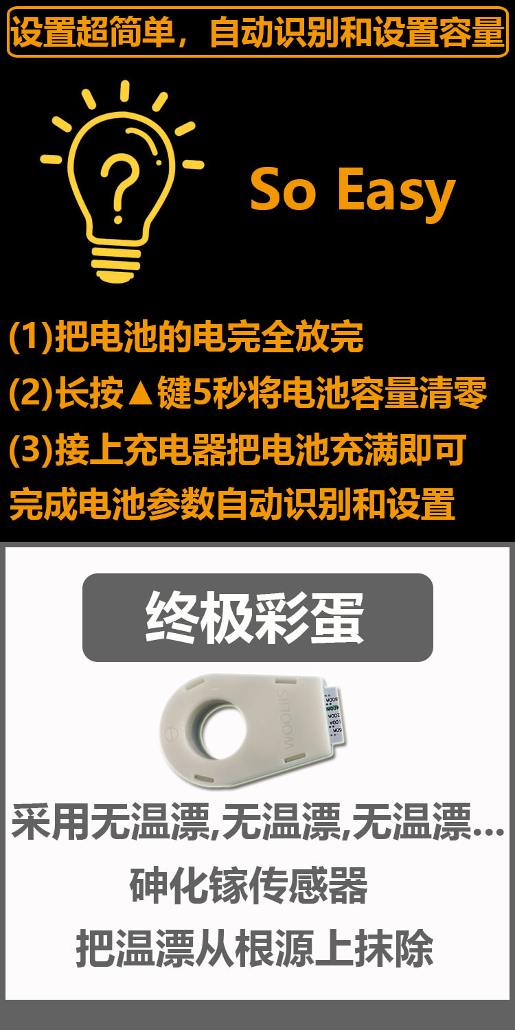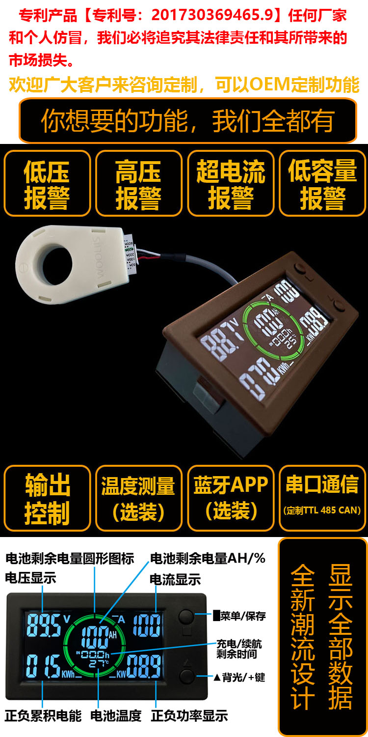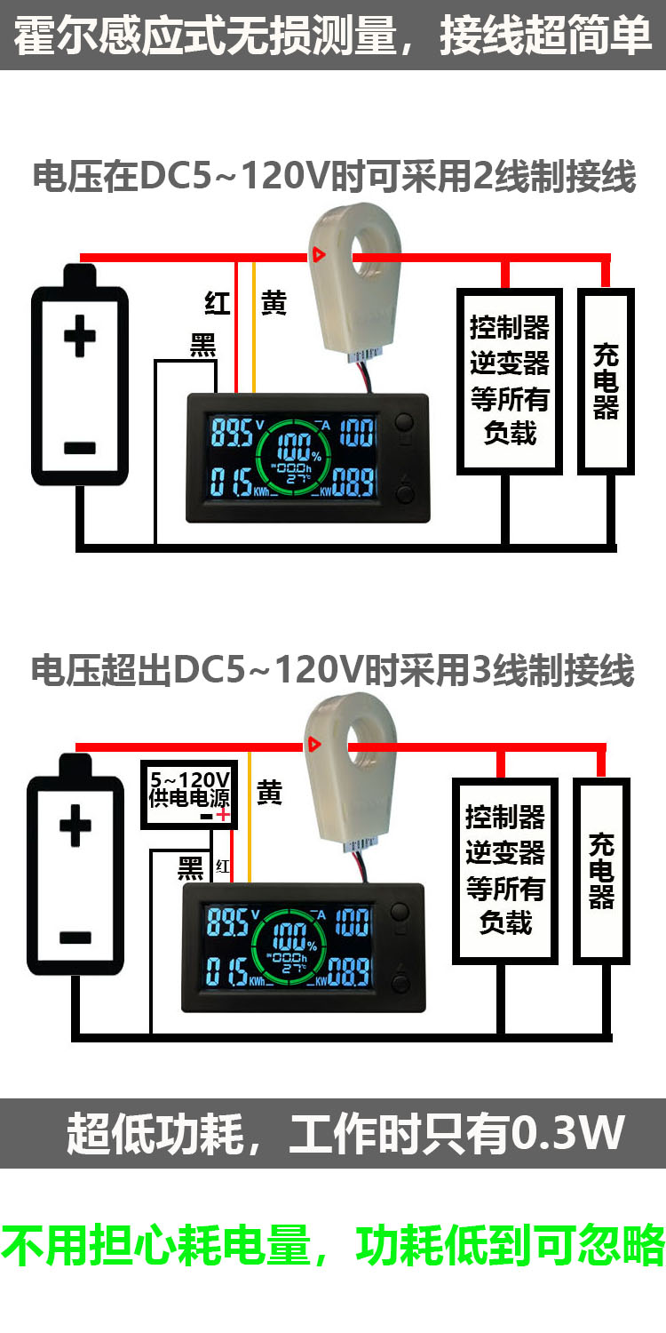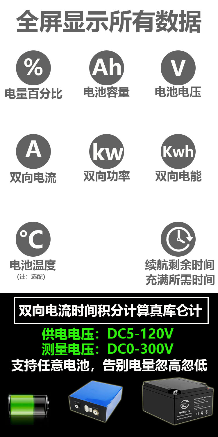 釆用全视角液晶屏,室内室外、夜晚白天、太阳光直射下都清晰可见,完全可以避免数码管表太阳下看不清楚的弊端。所有信息全屏同时显示。真实剩余容量计。电压、电流 、功率、电量、电能显示。适合各种蓄电池、铅酸,聚合物锂电、磷酸铁锂等电池,强烈推荐使用库仑计。可以完全避免电压粗略估算的容量表,一加油门电量就降下来的尴尬情况。