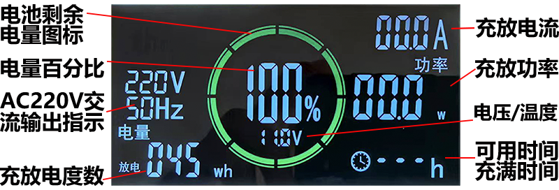可以测量显示:电池剩余电量百分比、电流、电压 、功率 、充放电度数、剩余可用时间/充满电所需时间。